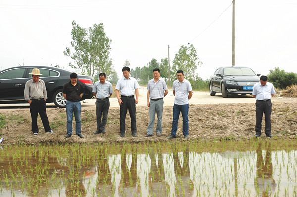 姜建友一行實地查看了旱整水栽栽插稻、農科所擺栽田、大華種業濱淮分公司、七大隊在田水稻長勢等現場。在場期間,姜總裁詳細了解濱淮分公司三夏生產進度,總經理郭世平就大小麥收獲、水稻栽插情況、保種情況等方面工作向姜建友作了匯報。