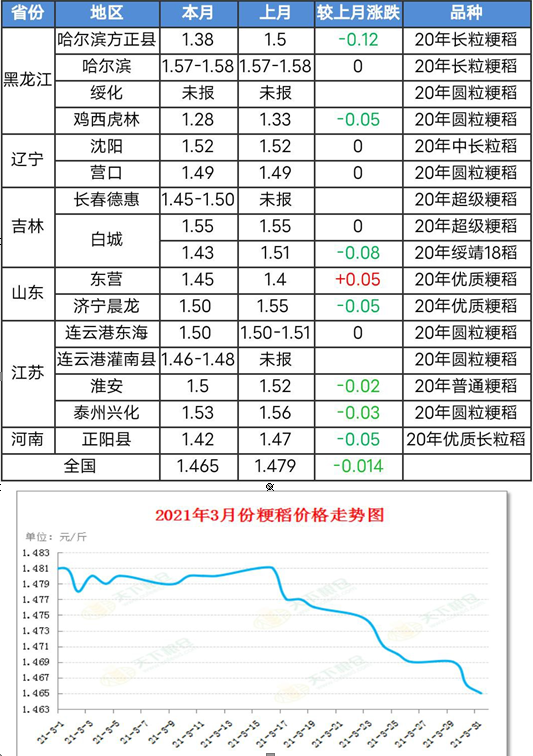 3月1日-3月31日,國內粳稻價格滯漲回落。截至月底,國內粳稻價格指數為1.465元/斤,較上個月跌0.014元/斤。蘇皖地區及東北地區粳稻收購價集中在1.25-1.58元/斤,大部分地區較上月跌0.02-0.12元/斤,僅個別地區漲0.05元/斤。各地價格月度變化 情況如下表: