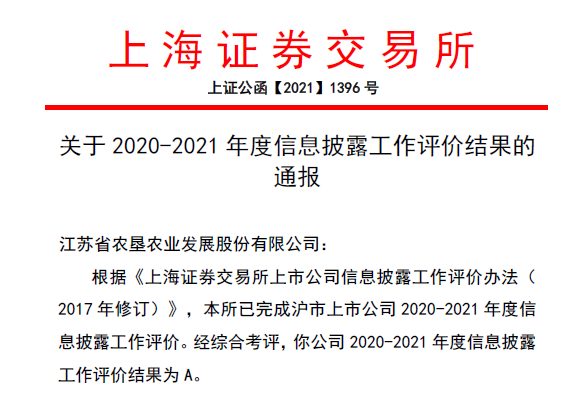 日前,上海證券交易所公布滬市主板上市公司2020-2021年度信息披露工作評價結(jié)果,蘇墾農(nóng)發(fā)(股票代碼:601952)獲評最高等級“A”級,是蘇墾農(nóng)發(fā)上市以來連續(xù)第二年獲得信息披露工作最高評級。