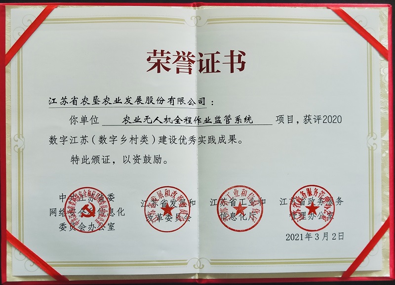 • 9月8日,2021年江蘇網絡強省建設工作推進會在南京召開,會議對2020年數字江蘇建設優秀實踐成果及2020年智慧江蘇十大標志性工程獎進行了頒獎。蘇墾農發農業無人機作業質量監管系統項目獲評數字江蘇建設(數字鄉村類)優秀實踐成果,在會上得到了表彰。