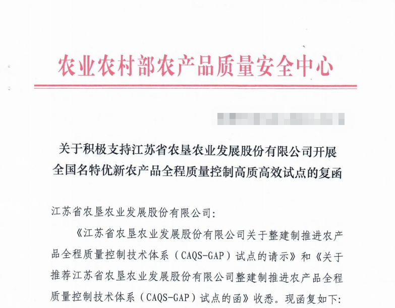 •        近日,農業農村部農產品質量安全中心正式復函批復江蘇省農墾農業發展股份有限公司(簡稱:蘇墾農發)積極支持開展全國名特優新農產品全程質量控制高質高效試點。蘇墾農發成為全國第二家、江蘇省第一家整建制獲批推進農產品全程質量控制技術體系(CAQS-GAP)試點單位的企業。
