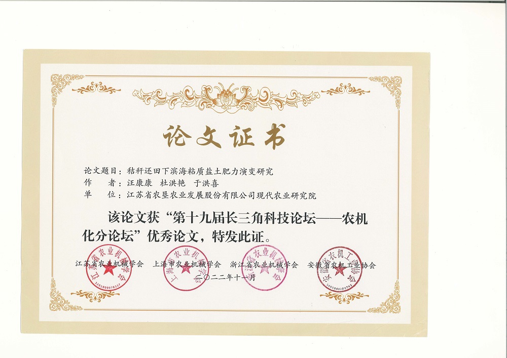 本次論壇共收錄論文47篇,經“三省一市”學(協)會推薦、評審,共評出優秀論文13篇,其中江蘇省5篇。蘇墾農科院首次參加該獎評選,報評的2篇論文都獲得優秀論文獎榮譽,這是蘇墾農科院多年來潛心農機農藝相結合的研究結果。蘇墾農科院將以此次獲獎為契機,持續加大農機農藝相融合的科研攻關力度,為蘇墾農發一體化擴量發展提供科技支撐。
