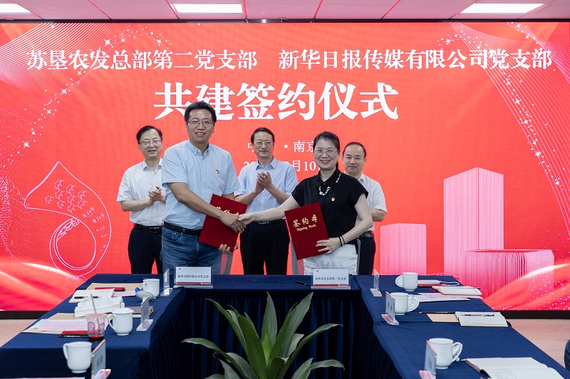 在新華日?qǐng)?bào)傳媒有限公司黨支部書(shū)記、新華日?qǐng)?bào)社(集團(tuán))編委、新華日?qǐng)?bào)傳媒有限公司總經(jīng)理樊萬(wàn)朝和蘇墾農(nóng)發(fā)黨委副書(shū)記、工會(huì)主席王進(jìn)強(qiáng)與黨委委員、紀(jì)委書(shū)記朱江勝見(jiàn)證下,雙方支部簽訂了共建協(xié)議。