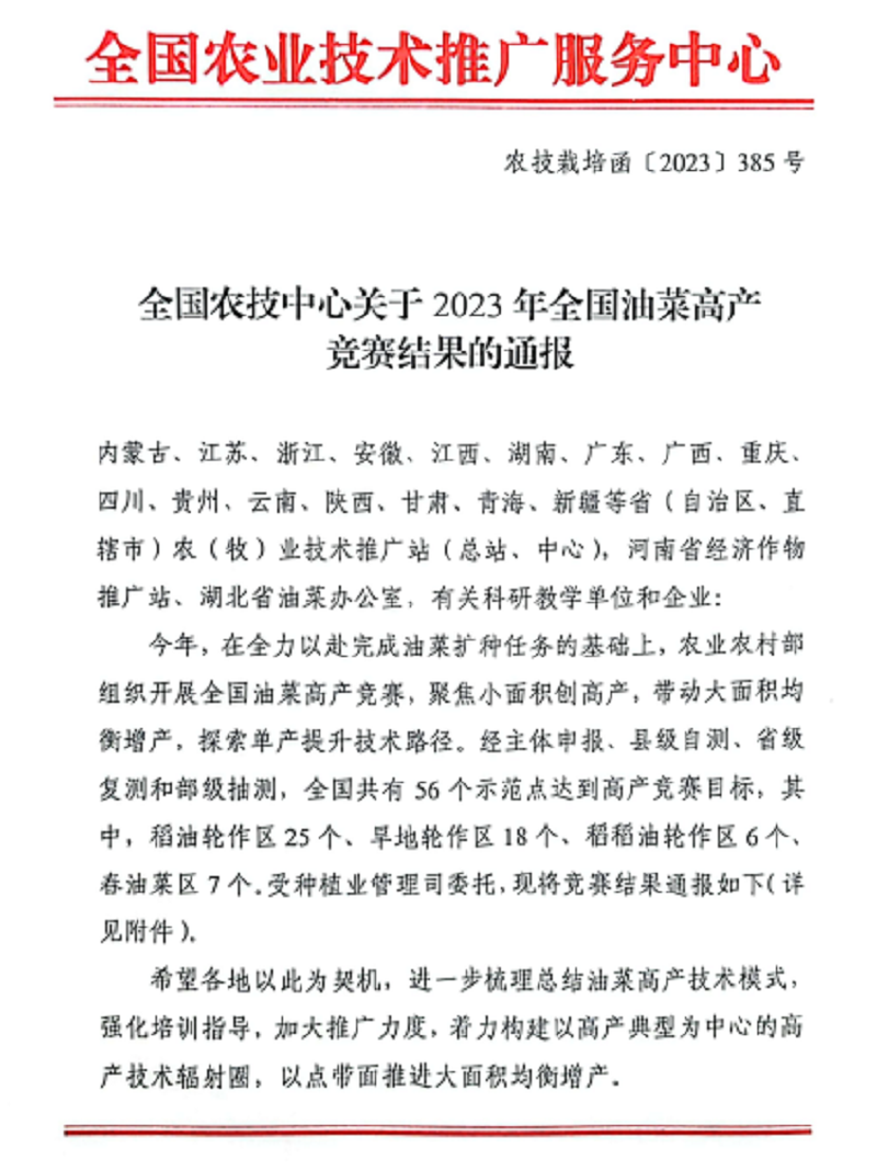 2023年全國油菜高產競賽活動由農業農村部全國農業技術推廣服務中心主辦,旨在“聚焦小面積創高產、帶動大面積均衡增產,探索單產提升技術路徑”。本次競賽,全國共有56個示范點達到高產競賽目標,其中,稻油輪作區25個、稻稻油輪作區6個、旱地輪作區18個、春油菜區7個。