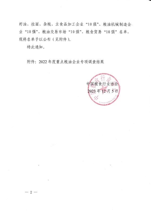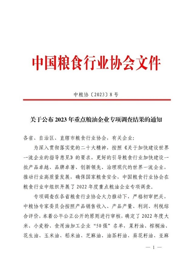 •        近日,我國2022年度大米、小麥粉、食用油加工企業“50強”名單,菜籽油、棕櫚油、花生油、玉米油、稻米油、芝麻油、油茶籽油、葵花籽油、亞麻籽油、掛面、雜糧、主食品加工企業“10強”、糧油機械制造企業“10強”、糧油交易市場“10強”、糧食貿易“10強”名單確定出爐。