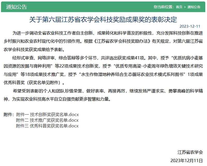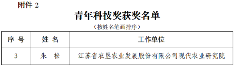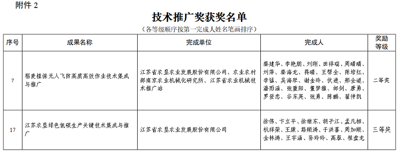 •       12月11日,第六屆江蘇省農學會科技獎勵成果獎和第六屆江蘇省農學會科技獎勵人才獎獲獎名單公布,蘇墾農發作為第一完成單位申報的“稻麥植保無人飛防高質高效作業技術集成與推廣”成果榮獲技術推廣獎二等獎、“江蘇農墾綠色低碳生產關鍵技術集成與推廣”成果榮獲技術推廣獎三等獎,蘇墾農發現代農業研究院朱松同志榮獲青年科技獎。