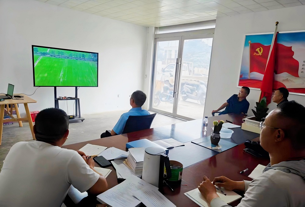 在外拓基地張灣生產區會議室,生產區管理人員和基地管理辦公室技術人員正在通過大疆司空系統對無人機巡田過程進行現場直播,操控人員在田間按照提前規劃好的航線操控無人機,生產區管理人員在會議室通過投屏進行現場觀看。觀看過程中,農業生產技術人員將田間管理不足之處一一指出,讓生產區管理人員更加直觀、充分的了解到哪些地方還需要改進。